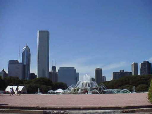 グラント・パークから見た噴水とシカゴの高層ビル